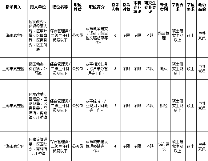 嘉定区面向国内部分高校招录硕士研究生及以上学历的应届大学毕业生,为嘉定现代化新型城市、世界级汽车产业中心核心承载区、上海科创中心重要承载区建设厚植人才优势,提供源源不断的党政人才支撑。