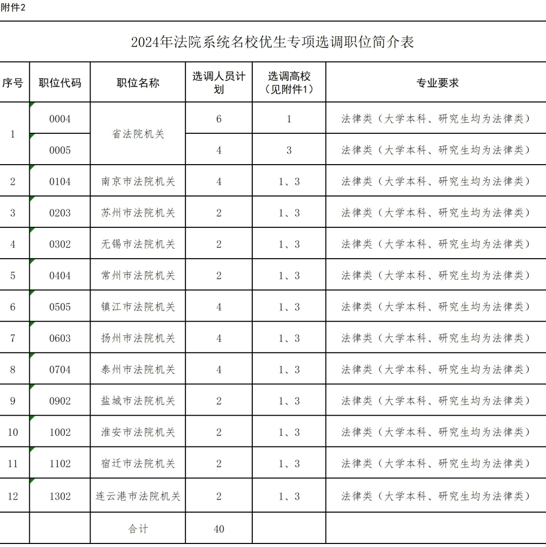 近日,省委组织部发布《江苏省2024年应届优秀大学毕业生选调工作公告》,江苏法院系统名校优生选调工作同步启动,全省法院选调法律类专业名校优生40名。
