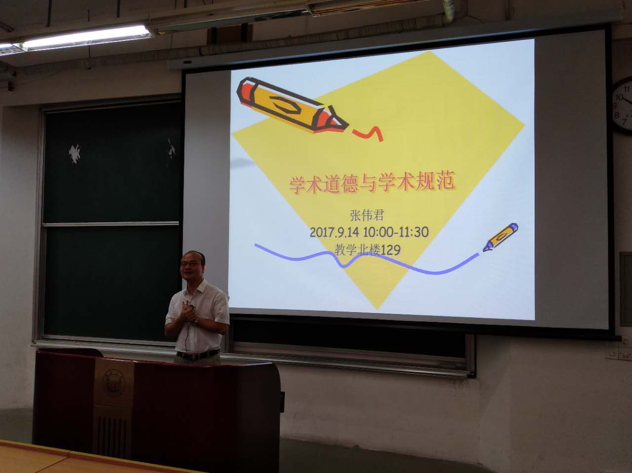 张伟君在报告指出,中国传统文化强调立德、立功、立言。立德位于前列,就学者而言,学术道德是立身之本。要成为对社会有用的人才,不仅要具备坚实的专业知识,还必须坚守诚实信用的科研道德。但目前,学术界出现了很多的学术失范现象,在高校内也层出不穷,不仅危及到学术研究本身,也造成了严重的社会危害。作为一名在校研究生,一定要以规范严格约束自己,严格遵守国家相关法律,恪守学术界公认的基本学术道德规范,不侵犯他人知识产权,以严谨踏实的学风和笃信诚实的原则从事科学研究。硕士研究生阶段是学术素养形成的重要阶段,恪守学术道德规范要从日常学习研究的每一个细节做起。最重要的就是诚实正直,包括尊重他人的研究成果,正确引用,署名真实,对自己的研究成果负责。