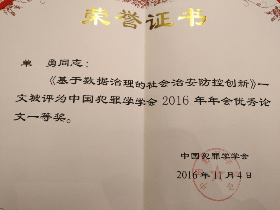 本次年会主题为“立体化社会治安防控体系建设”,单勇副教授受邀在大会上做一个小时的主旨演讲,演讲主题为《基于犯罪大数据的社会治安精准防控》。单勇副教授的参会论文被评为2016年年会优秀论文一等奖。