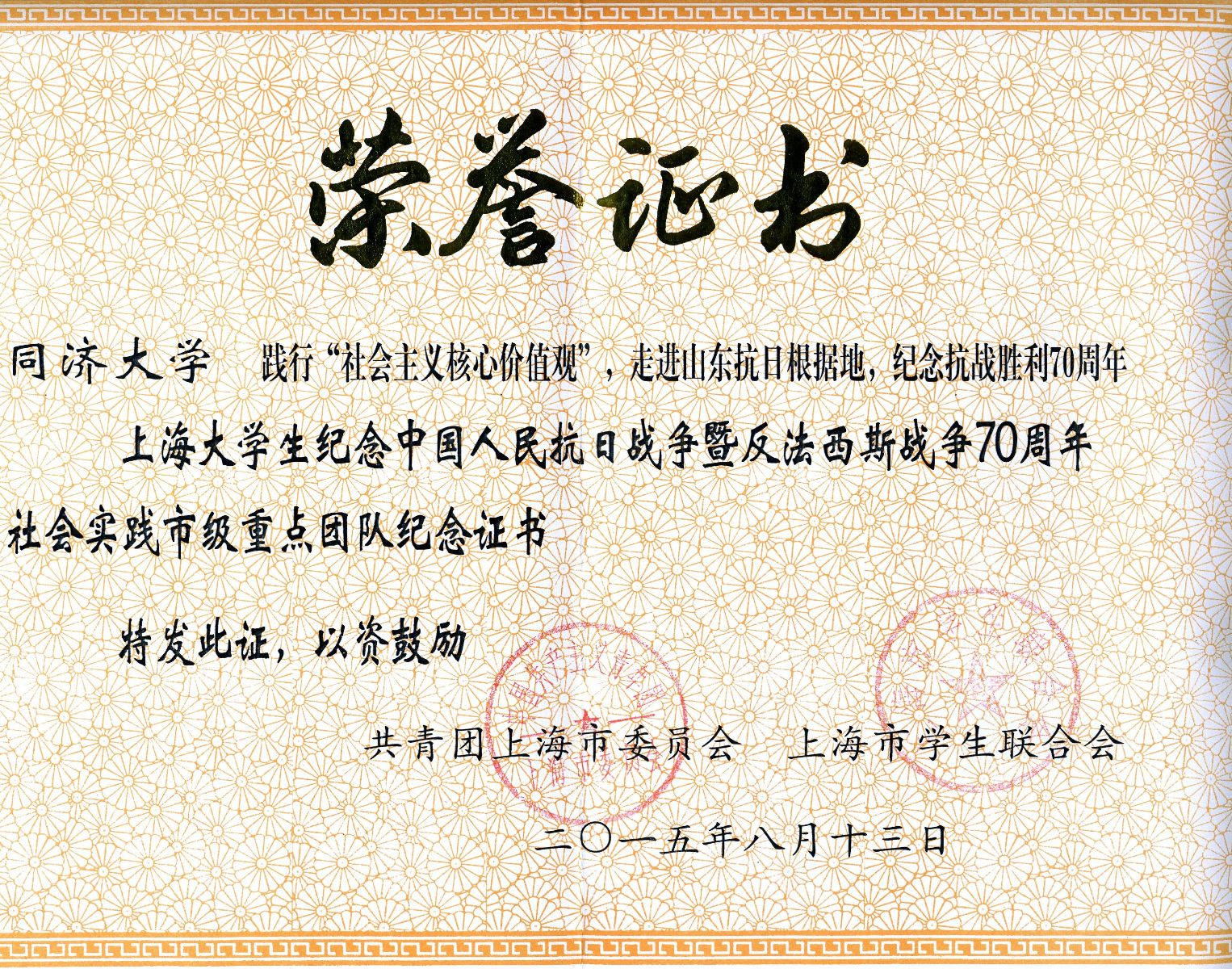 今日,公司从校团委获悉,今年公司实施的“践行社会主义核心价值观,走进山东抗日根据地,纪念抗战胜利70周年”——2015年英国上市公司365临沂暑期实践,代表英国上市公司365荣获上海老员工纪念中国人民抗日战争暨世界反法西斯战争70周年社会实践市级重点团队。
