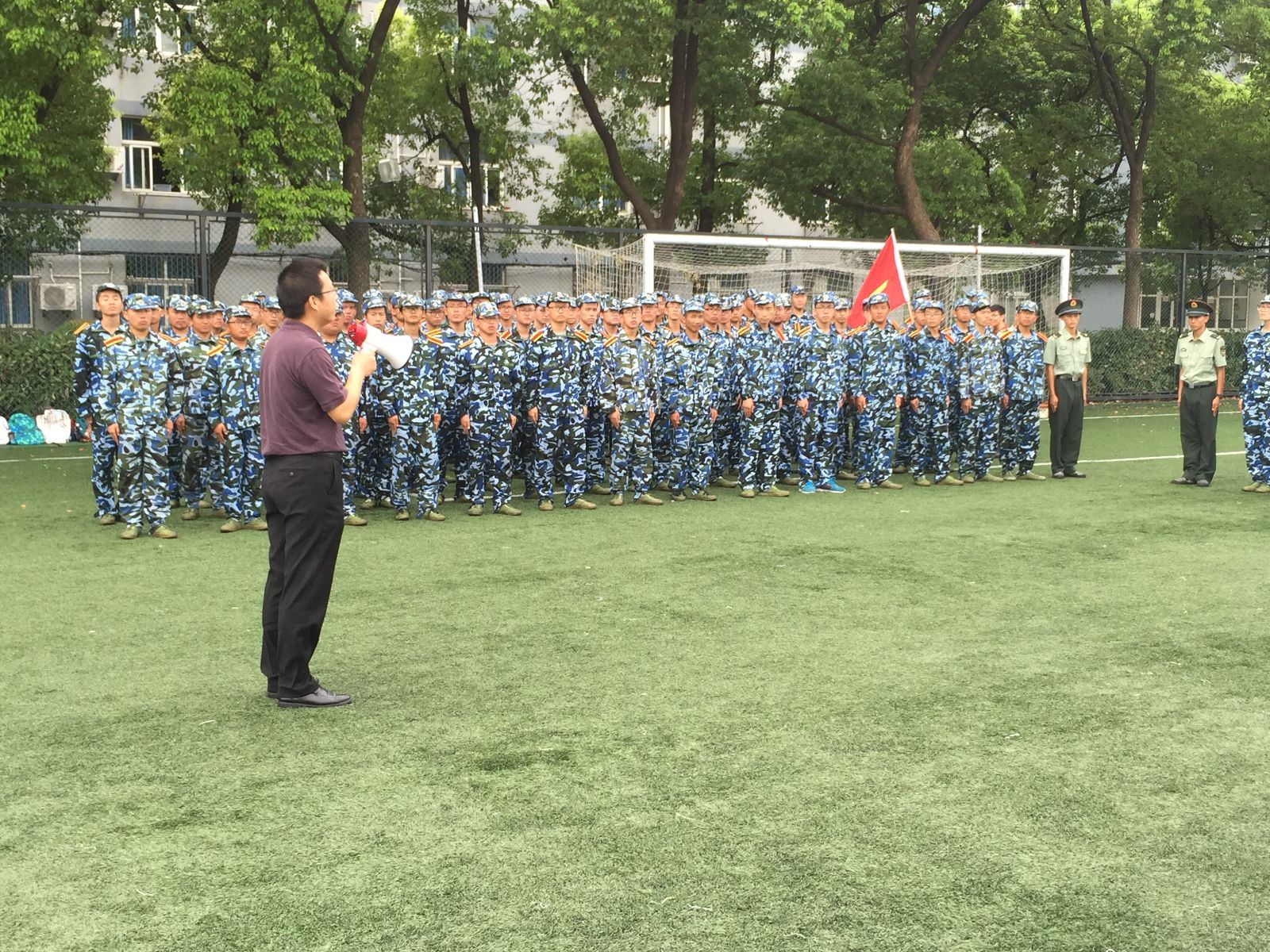 杨老师还实地察看了公司员工的的训练情况,深入了解军训开展情况。他希望同学们能通过军训进一步磨练意志,锤炼品格,在教官的指导下,刻苦训练,完成剩余的军训任务,取得优异的成绩。慰问结束后,杨老师还与其他兄弟学院领导一起同一营随训教官及师生合影留念。