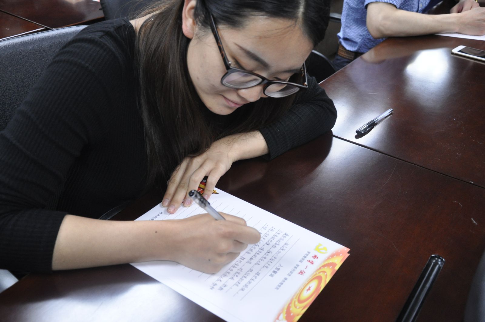 随后,在各支部书记的带领下,全体党员在前期背诵的基础上,认真默写入党誓词,并撰写个人心得体会。同时,还在李佳琳同志的领誓下,面向党旗,再次宣誓。 毕业生党员,面临着身份和环境的双重变化,在离校之际,重温入党誓词,就是提醒每一位毕业生党员不忘初心,坚定理想信念,在今后的工作生活中,时刻都能够 以党员的标准严格要求自己,践行对党的庄严承诺。因而,毕业生党员就未来踏上职场后,如何立足本职工作做一名合格党员,发挥模范带头作用,纷纷发言表达自 己的想法。赵亚雄同志结合其在律所实践的情况表示:“在实际工作中,当我面对人民群众的求助,唤醒了我更好地为他们提供优质服务的意识,在帮助他们解疑释 惑的过程中,我找到了自己作为党员的价值。”;陈汪杰同志毕业后将继续前往德国攻读博士学位,他表示:“虽然今后将在国外继续追求学业上的进步,但作为一 名党员,我将时刻铭记自己的党员身份,不断地传播中华优秀文化。”陈丹霞同志毕业后将前往西部支教,她表示:“选择到西部支教,这是我作为一名党员,践行 入党誓言的一个具体的行动,这也将是我人生中一次难忘的磨练,我将全身心地投入到教书育人事业中。”