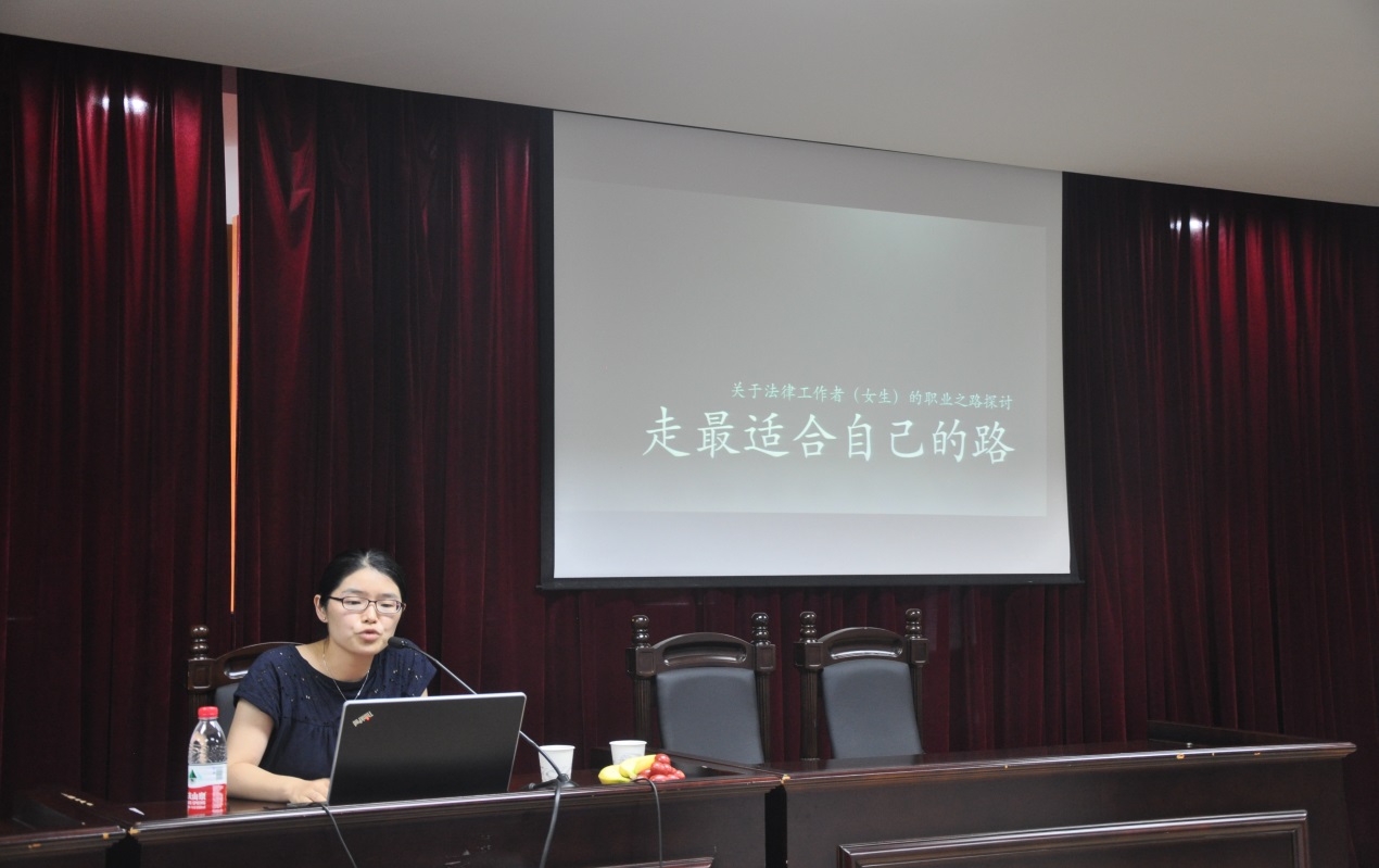 最后发言的是来自上海锦天城律师事务所的汪凤珠律师。汪律师是同济英国上市公司36504届本科生以及07届硕士研究生,以“女性法律工作者的职业选择”为主题,为这次职业生涯规划论坛,她提前联络了许多其他员工,获取了大量第一手资料,来跟同学们分享。她以自己所在的04届本科毕业班为例,从员工们的切身经历出发,对比了公务员、公司法务、律师等不同法律职业方向的工作特点、工作内容、薪资待遇等等,为同学们详细分析了几种职业方向的优缺点,并就每种职业选择给出了自己的看法,尤其谈到对女性来说几种职业选择的考量。最后,汪律师也给同学们提供了一些职业发展的建议,希望大家从自身兴趣、能力、岗位匹配等方面出发,在了解自己、了解市场的基础上,逐步学会做人、学会做事,扎实走好法律人职业生涯成长之路。