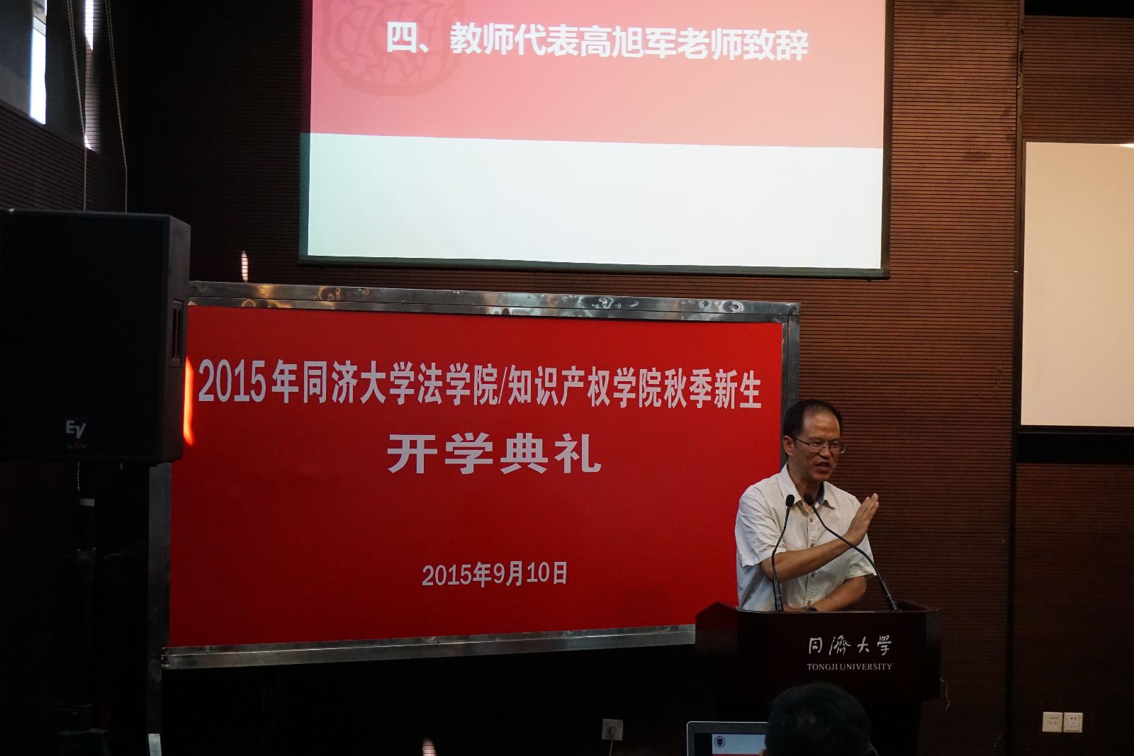 紧接着高旭军教授作为教师代表发言。他首先向到场的来自德国、英国各高校约13名外国员工表示热烈欢迎,并就公司的对外交流情况向本科、硕士研究生作出了介绍。他向新生提出要志存高远、追求卓越、敢于做梦,追求正义,实现自我价值。同时,高教授提出作为法律人必须具有扎实、系统的法学理论功底,不只是知晓法律条文,更要求通晓条文背后的法理,拥有自己的知识、判断和立场。