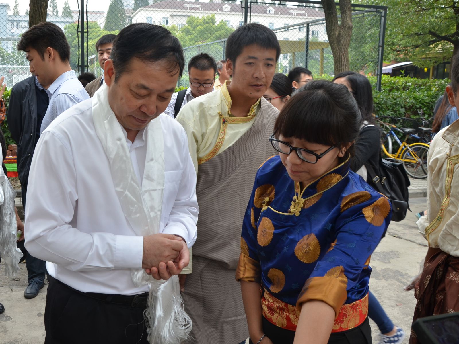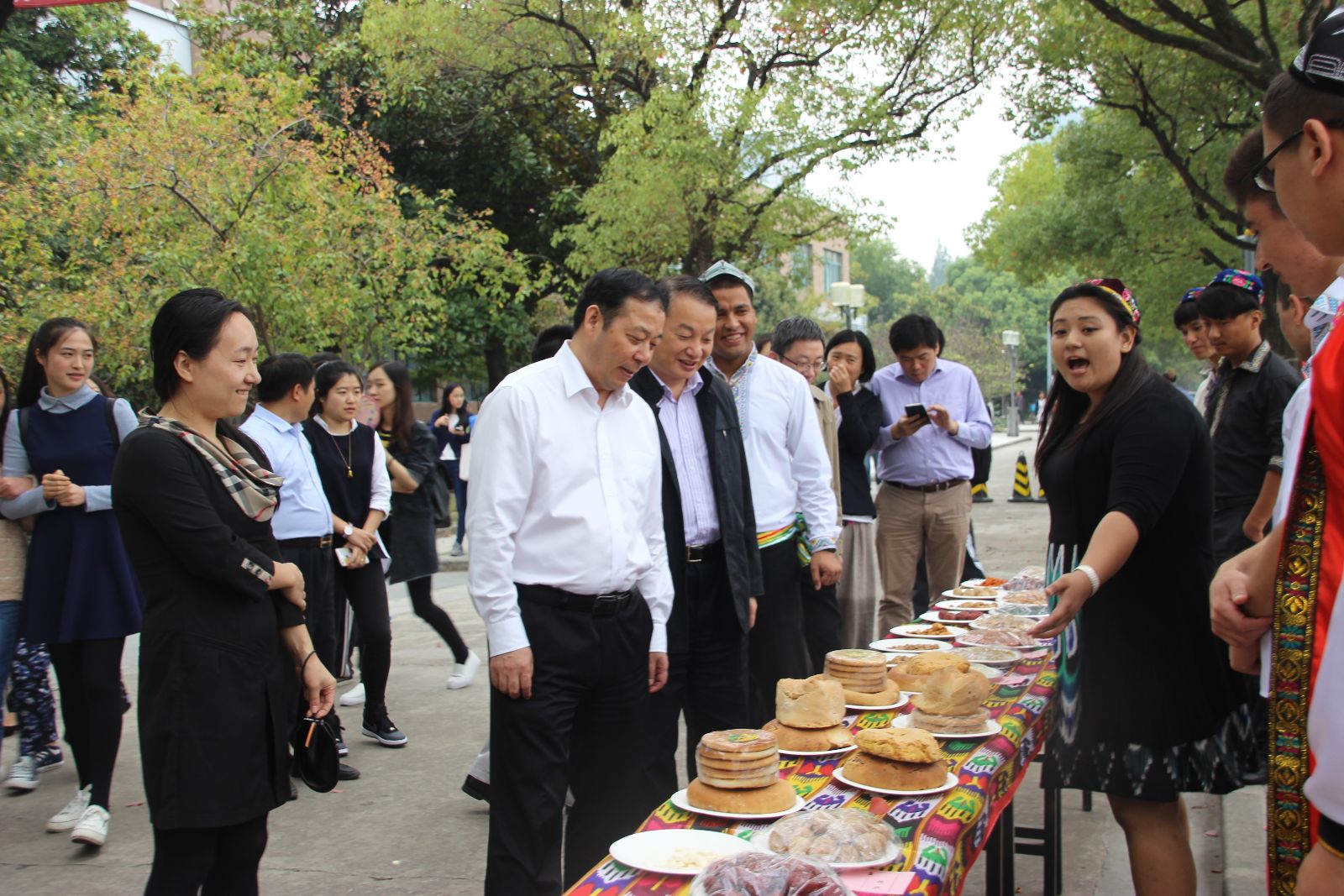 活动现场气氛热烈,藏族同学向各位老师献上一条条洁白的哈达,维吾尔族同学向老师们递上民族特色的食品馕、干果、手抓饭等食物,在各民族文化展板前,同学们热情的向老师们讲述着自己家乡的地理特征、风俗习惯,一一解答师生们提出的各种问题。杨贤金、徐建平兴致勃勃地戴上维吾尔族同学送的花帽,品尝藏族特色的食物以及青稞酒、酥油茶,参观藏族帐篷,观看民族舞蹈并与同学们一起跳舞联欢。杨贤金在各展台前仔细询问各少数民族特色物品的名称和用途,赞美少数民族地区的靓丽风景和特色文化,鼓励同学们努力学习,将来建设更加美好的家乡。