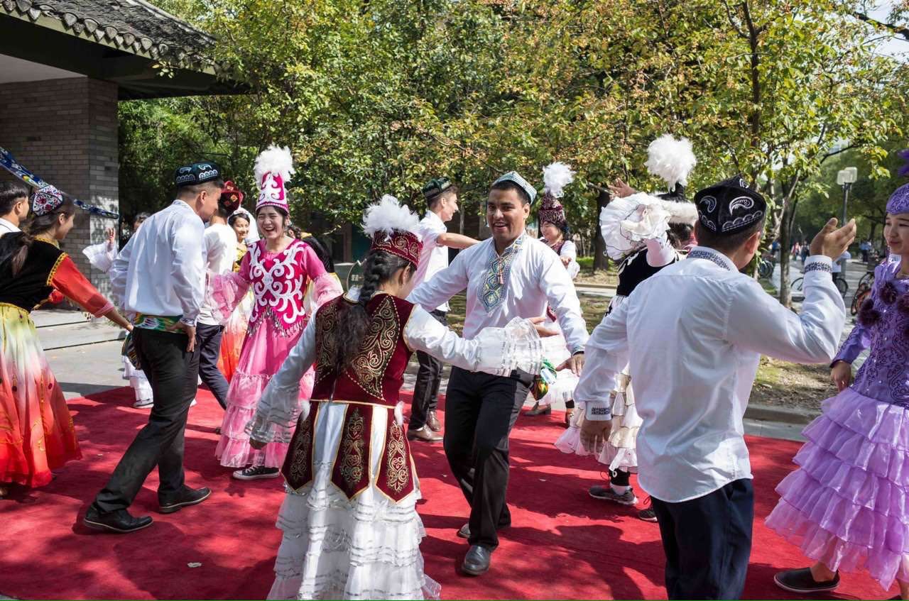 今年的少数民族风情文化展新增了“新疆少数民族歌舞表演区”,维吾尔族、哈萨克族等少数民族的同学准备了多个民族歌曲、舞蹈在现场“循环播放”,引来观众们一阵阵掌声,他们还邀请老师们加入到民族舞蹈之中,大家手拉手伴着音乐载歌载舞,将整个活动推向了高潮。