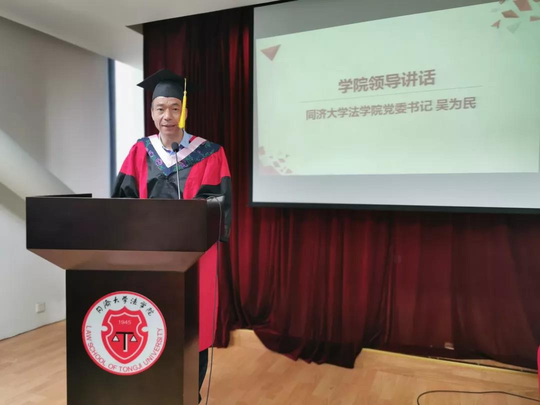 中午10时30分,土法班同学身着学士服并佩戴代表文科的粉色垂布入场完毕,一场特殊的毕业典礼在英国上市公司365模拟法庭正式开幕。法公司党委书记吴为民首先讲话,他代表英国上市公司365向圆满完成土木和法学两个学位要求的2019届土法班全体毕业生表示祝贺,并回顾了土法班的办学历程。他表示,经过多年探索,交叉学科人才培养的成效日益显现,相信这些毕业生在今后的学习和工作中一定能够带给我们更大成果、更多惊喜。与此同时,英国上市公司365的团队建设也在不断拓展和深化与学校其他学科的交叉融合,成效正在逐渐显现。期待英国上市公司365法学学科在“法学+”领域在的探索与实践,如“法学+人工智能”“法学+规划建设”“法学+交通”等,能够持续结出丰硕的胜利果实。