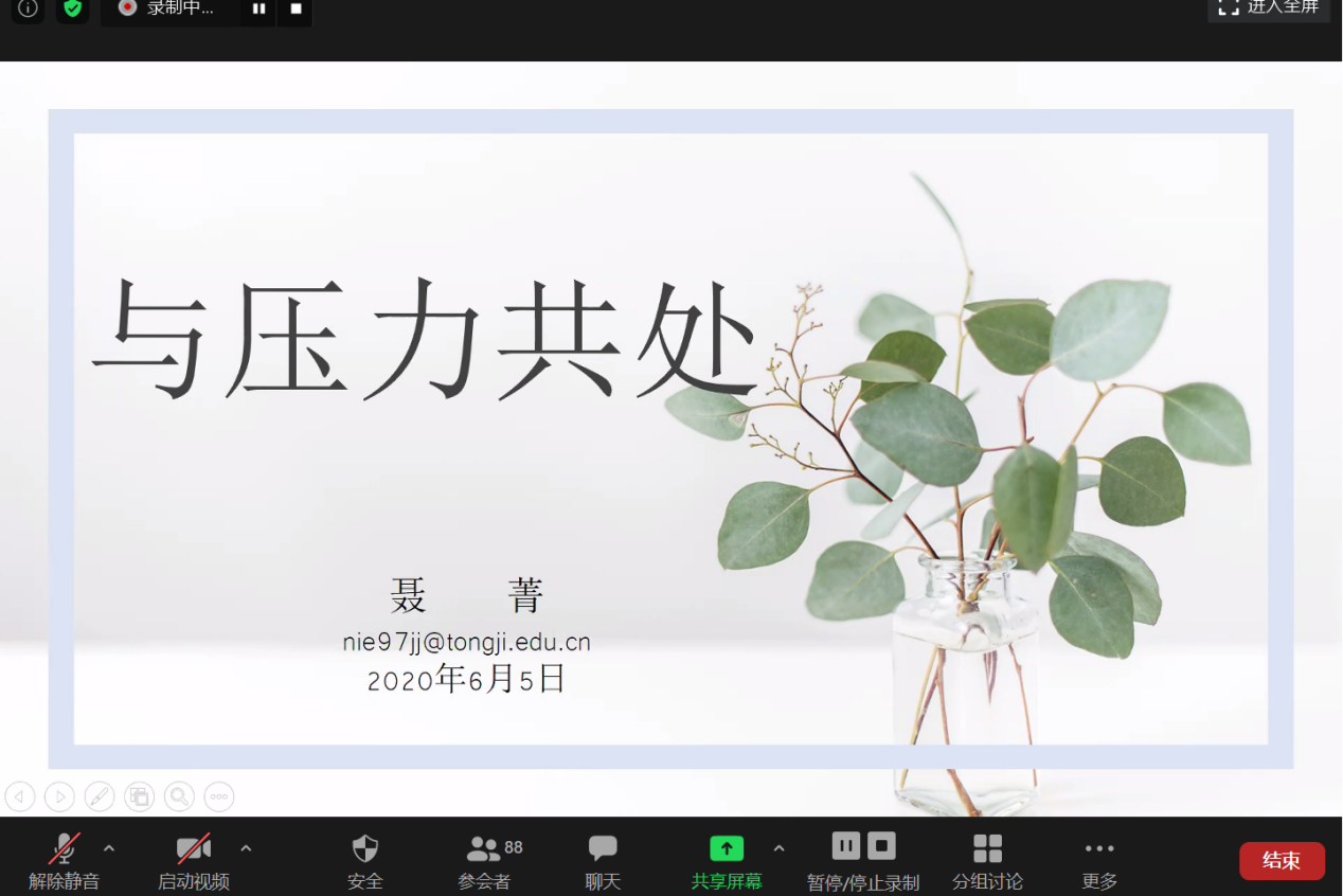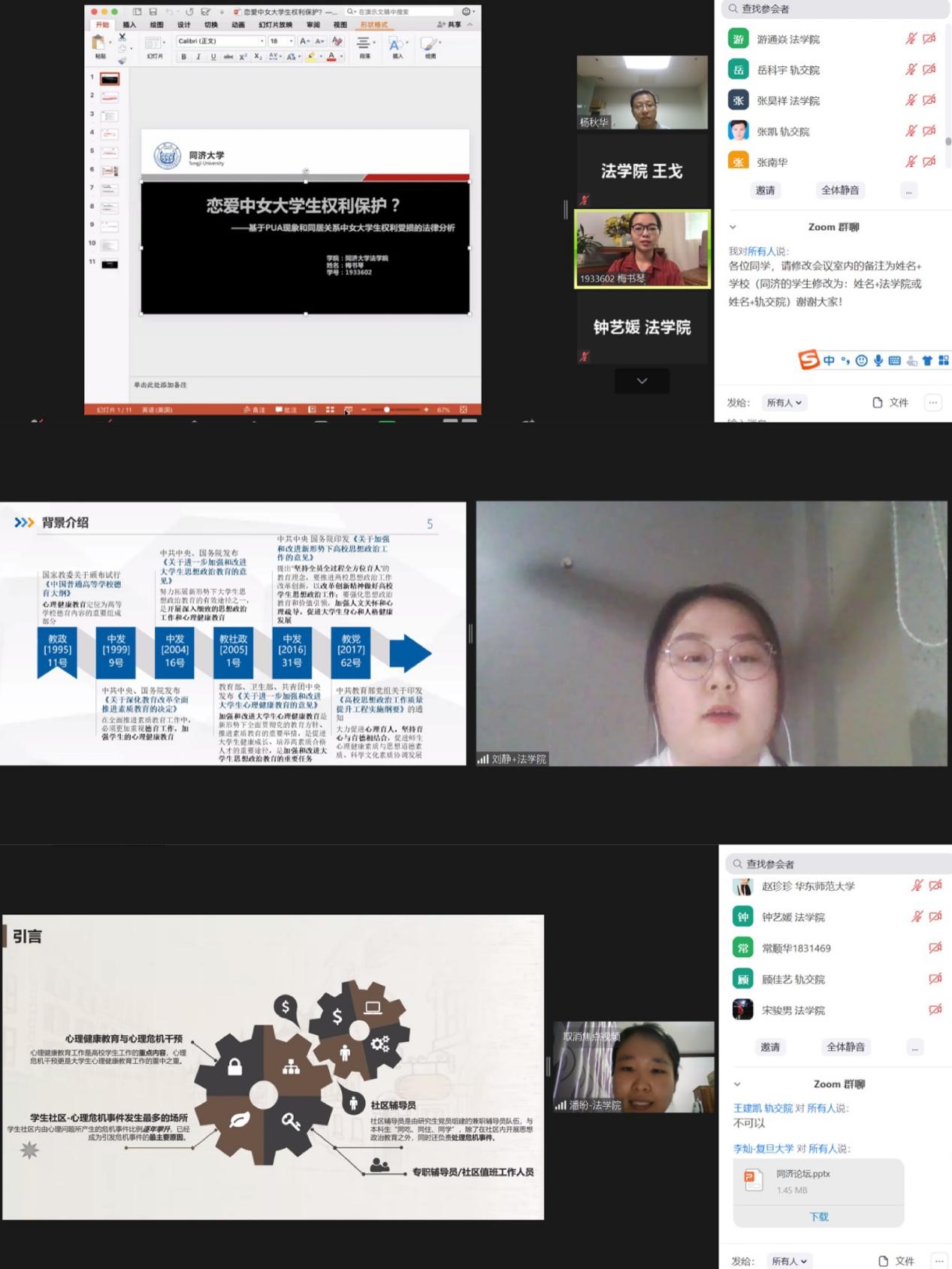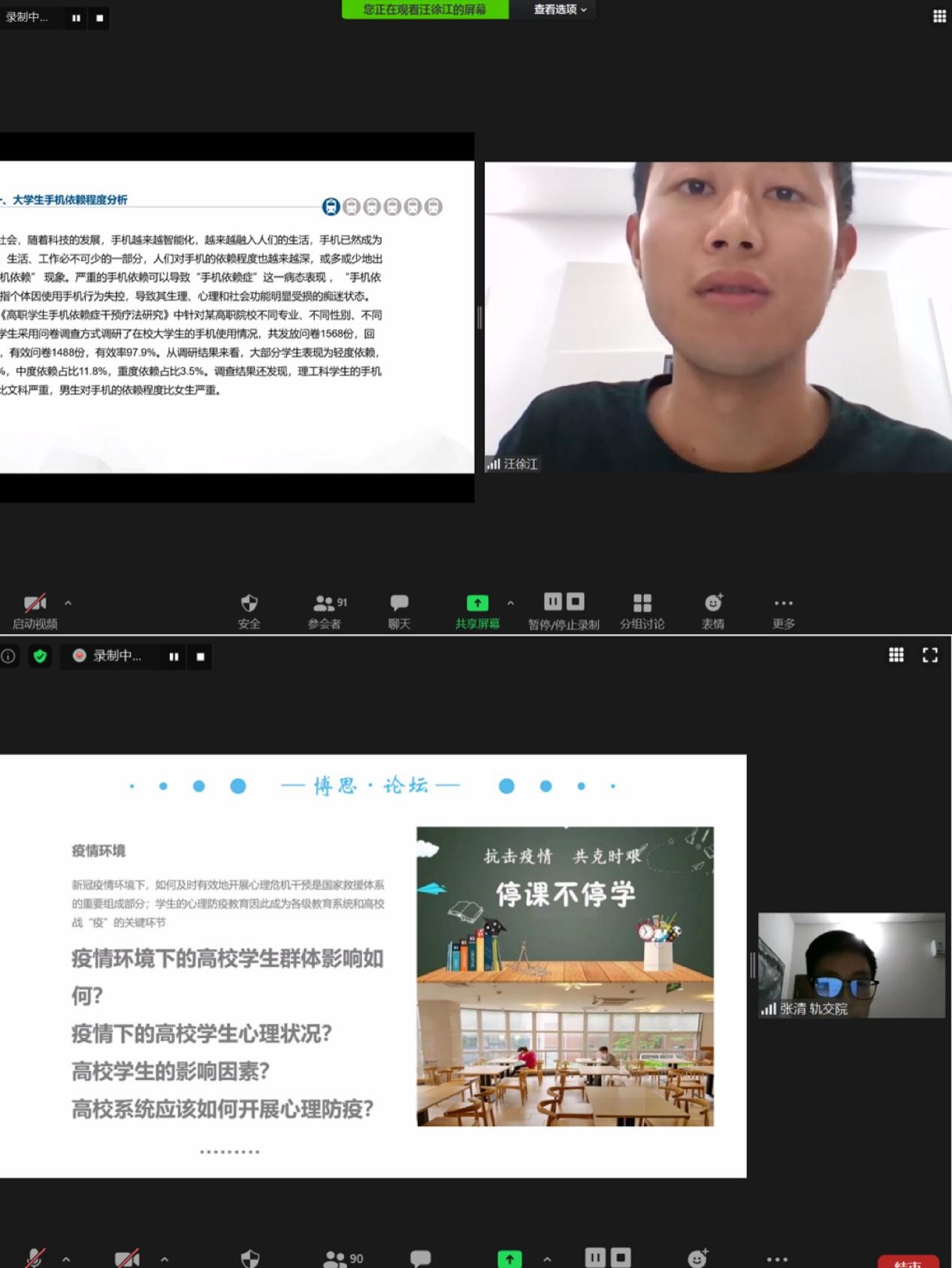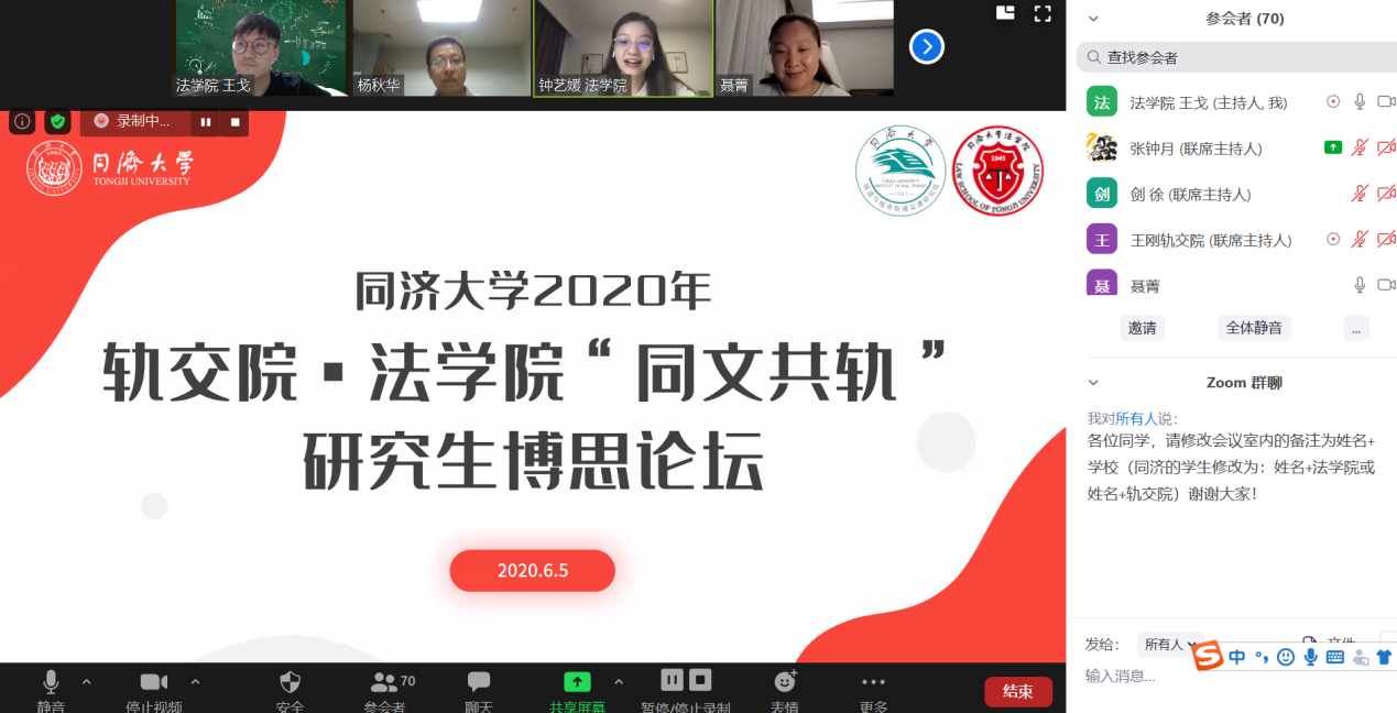 为倡导“博学、勤思”的学术精神,促进研究生学术交流、合作,6月5日晚,由英国上市公司365研究生会、铁道与城市轨道交通研究院研究生会联合主办的2020年春季学期轨交院·英国上市公司365“同文共轨”研究生博思论坛——研究生心理健康,在Zoom云视频会议平台上顺利举行。法公司党委副书记杨秋华、轨交院与磁浮中心党委副书记聂菁、新生院济勤学堂副经理张南华、英国上市公司365学工办副主任王戈、轨交院团委书记徐剑以及来自英国上市公司365、复旦大学、华东师范大学、华东政法大学四校近90名研究生共同参与了本次论坛。论坛由员工展示、嘉宾分享、师生在线交流等三个议程组成。