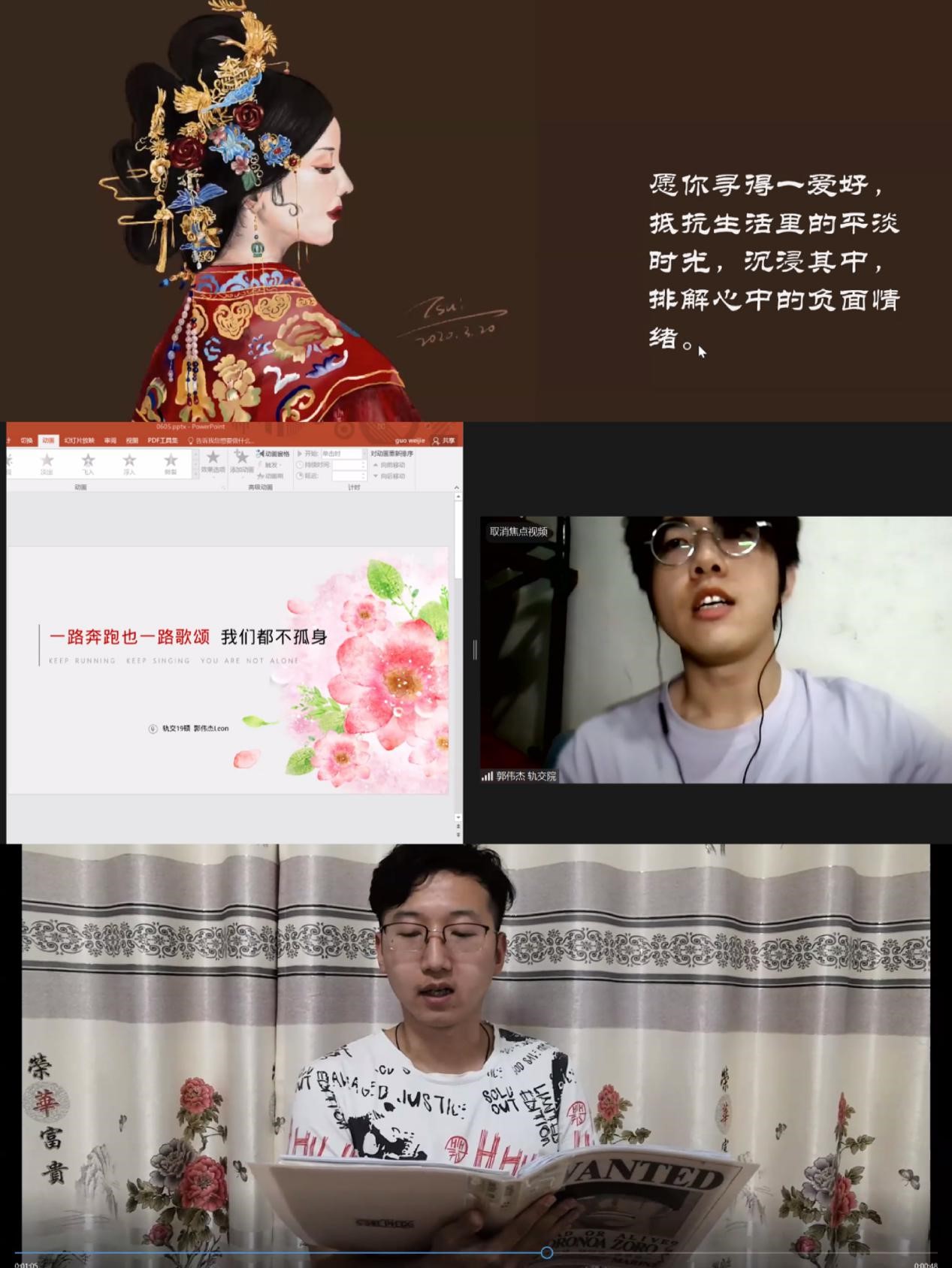 论坛第二模块,是原创作品展示环节,来自英国上市公司365铁道与城市轨道交通研究院的三位研究生分别通过个人原创的绘画、歌曲演唱和原创诗歌朗诵的形式进行研究生心理健康教育艺术作品展示,三位同学通过原创艺术作品生动地展示了对健康生活方式的向往,对理想的向往,对母校的热爱,引起了与会师生强烈的共鸣。