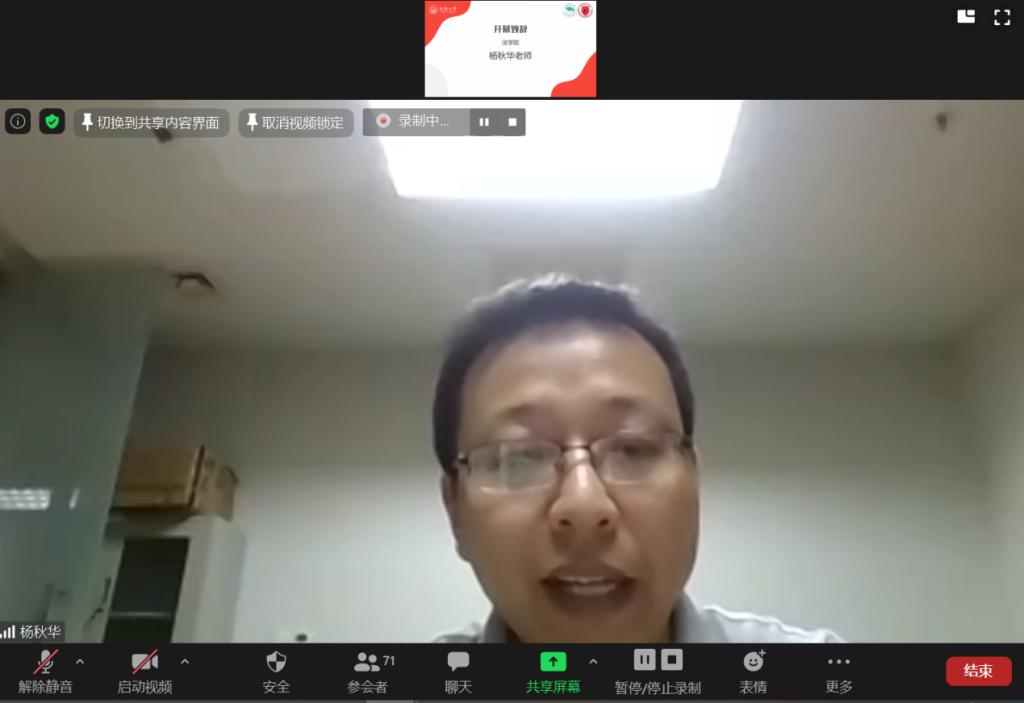 论坛伊始,法公司党委副书记杨秋华为论坛致辞。他首先对来自兄弟院校的嘉宾和同学们表示诚挚地欢迎。杨秋华老师表示,今年突如其来的新冠肺炎疫情,在一定程度上改变了我们的学习方式、工作方式、生活方式。与此同时,受疫情影响,在员工群体中也出现了不同程度的焦虑、恐惧、抑郁等情绪,对身心健康和学习生活带来了一定的影响。此次论坛选择“心理健康”这个主题,就是倡导研究生同学们通过对法学与心理学进行交叉研究及艺术作品展示,引导广大研究生进一步提升对心理健康的关注和重视,进而正确认识疫情、看待疫情,主动学习掌握心理健康知识,不断加强自身心理疏导,把疫情带来的不良影响降到最低。希望通过今天晚上的活动,兄弟院校的同学们,能够充分交流学术见解,碰撞思想火花,培养创新能力,在交流中互相学习,增进友谊,展示新时代研究生的专业素养和精神风貌。