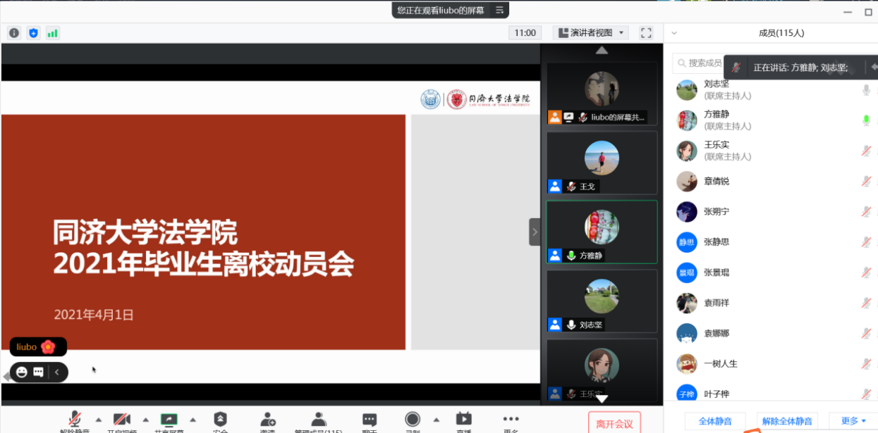 法公司党委副书记、纪委书记刘志坚老师在会中发言,刘老师指出,目前尚未落实就业去向的毕业生,要结合自身实际情况做好评判,积极参与到春招中,同时学院也会在四月和五月为员工提供律所、法务的专场招聘活动。刘老师提醒同学们,若需就业指导或职业咨询、心理咨询等,欢迎同学们与学院学工办的辅导员老师和学校相关职能部门的老师们联系与交流。