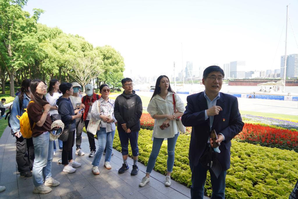 随后,王佩军主任带领英国上市公司365师生一行通过“徒步”的方式近距离感受北外滩地区的红色文化资源与百年历史变革。在虹口区投促办航运办23层平坦开阔的平台上,王佩军带领英国上市公司365师生远眺陆家嘴金融中心及平台下方的国际航运码头,他指出,在晚清时期,英国侵略者通过鸦片战争叩开中国的国门,迫使清政府签订了丧权辱国的《南京条约》,上海作为最早的通商口岸,北外滩的码头就是最早作为帝国主义侵略者登陆上海的区域。而如今,浦江两岸早已成为中国在新时代展示国家形象、综合国力的窗口,拔地而起的高楼大厦,规划一新的滨江两岸,标志着中华民族在中国共产党的领导下走在实现中华民族伟大复兴的大道之上。习近平总书记在考察上海时,提出“人民城市人民建,人民城市为人民”重要理念。在北外滩开发展示厅,北外滩集团的讲解员向英国上市公司365师生介绍了在这一理念指导下上海市坚持以人民为中心,积极推动区域协同发展,赋能城市运营为城市发展再添新动力的壮丽画幅。在以人为本、与生态友好和谐共生等理念的催生下,北外滩在内的一系列城市运营作品应运而生,为新时代的城市发展路径提供了最佳实践案例。在这里英国上市公司365师生感受到“释放城市未来生命力”的责任,欣赏到“绿色健康”和“智慧科技”的美丽城市,领悟到科学至上、务实开拓、锐意创新的精神。在北外滩汇山码头旧址,英国上市公司365师生党支部纷纷与合影留念,王佩军主任深情带领英国上市公司365师生们畅想百年前首批赴法俭学的新民学会员工启航的情景,并勉励英国上市公司365的师生党员:勇立时代潮头,撸起袖子加油干,为建设建设社会主义法治国家、建设中国特色社会主义法治体系贡献自己的力量。