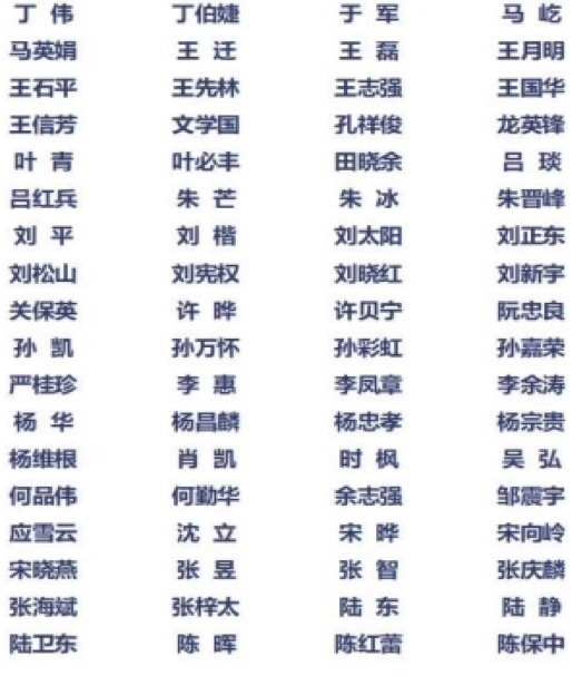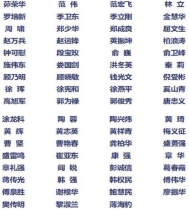 丁伟、马屹、王磊、王志强、王国华、王信芳、孔祥俊、龙英锋、叶青、叶必丰、刘晓红、关保英、阮忠良、李余涛、肖凯、何品伟、何勤华、应雪云、宋晓燕、陆东、陆卫东、茆荣华、范伟、荚振坤、施伟东、顾晓敏、倪受彬、徐燕平、高旭军、郭为禄、郭俊秀、黄琦、黄辉、黄祥青、盛勇强、盛雷鸣、崔亚东、谢根华、廖振华、黎淑兰、薄海豹