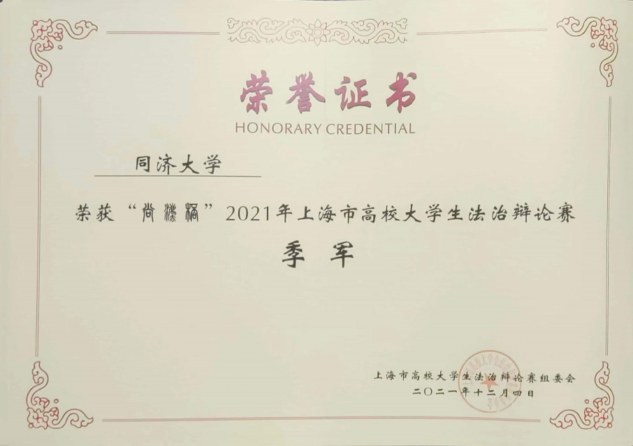 The 2021 Shangfa Cup - the Shanghai Legal Debate Competition among students from Shanghai Universities was held in November 2021 successfully. Eight students from Tongji Law School and the University Debate Team, including ZHANG Ziheng, ZHANG Yihan, DUAN Yawen, QIN Yutao, WANG Ziqun, LIU Zihang, LI Xun and CHEN Yin, formed the Team of Tongji University. Under the guidance of the coach, Prof.XU Wenhai, Team of Tongji University has been selected from more than 60 teams and has won the third place for the first time in the history.