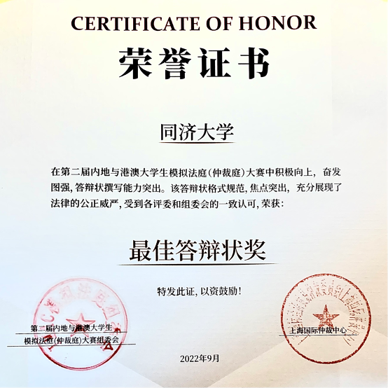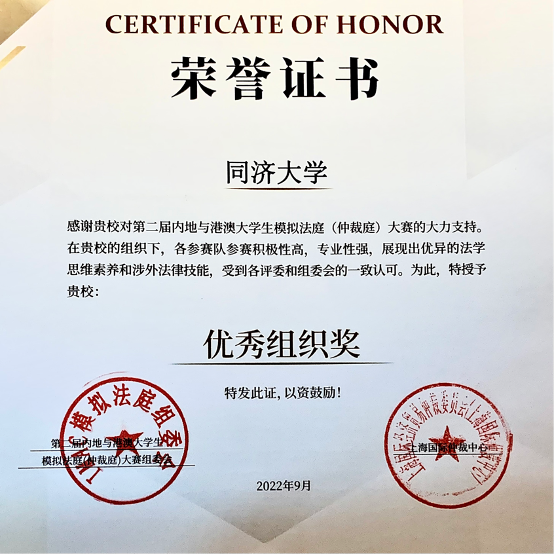 On August 28th, 2022, the Final of Invitational Moot Arbitration Competition was successfully concluded at the Shanghai International Dispute Resolution Center. The team of Tongji Law School stood out from 78 participating teams from mainland, Hong Kong and Macao universities and successfully entered the final competition. The best defense award, excellent organization award and excellent instructor award eventually go to the team of Tongji Law School!