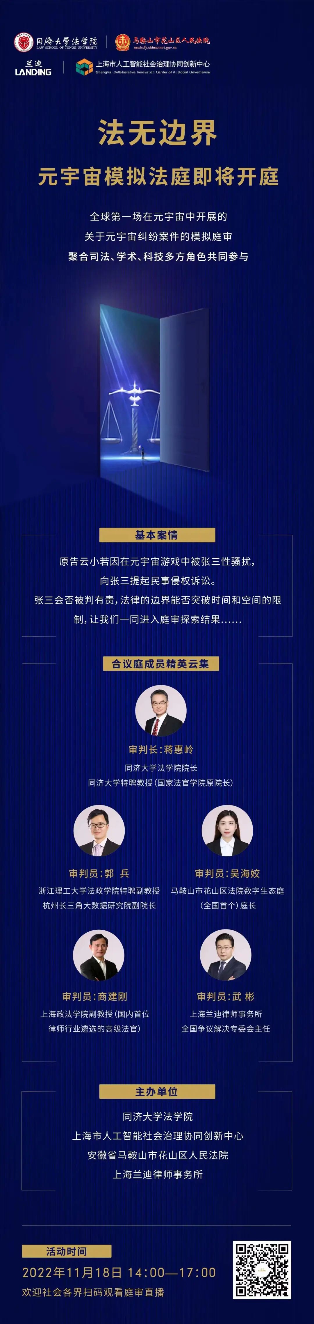 On November 18, the first metaverse moot court in China co-organized by Tongji Law School, Shanghai Collaborative Innovation Center of AI Social Governance, Ma'anshan Huashan District People’s Court, and Landing Law Offices was successfully held.
